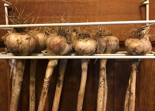 Here's my garlic crop for the summer, drying out. It's my first year trying garlic, so I'm sort of stumbling forward with this, but it seems easy enough. I'll be planting again in the late autumn, and cooking with some of it in the meantime. Garlic is delicious and quite healthy. Although perhaps not the best on your breath for romantic encounters.