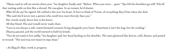 Secondly, the second book in the series, An Elegy for Hope, is in the works. I’m about 40k words into it. The world is expanding, and I’m really liking some of the new characters I’ve created. I’ve been doing a lot of research and… more on this in a bit.