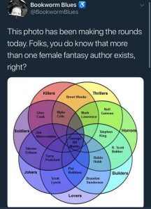 So, I say, “Folks, you do know that more than one female fantasy author exists, right?” and I’m getting threatened, but the dudes who passed this diagram around before I ever got my hands on it are okay? I’m just trying to understand the standard here.