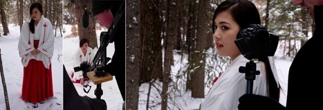 Shoot day dawned overcast—great conditions for shooting—but more than a little chilly at -16°C (3°F). Once the actress was ready, she and the five-person crew had to trek twenty minutes into the woods. And, of course, I was tagging along, determined not to miss out.