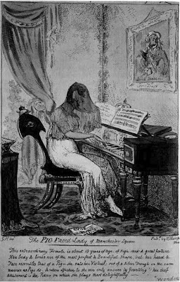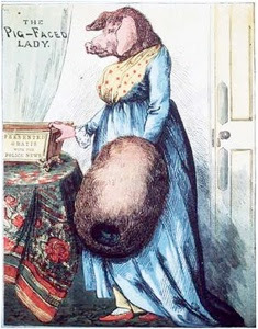 The magical elements gradually vanished from the story, and the existence of pig-faced women began to be treated as fact. The story became particularly widespread in Dublin in the early 19th century, where it became widely believed that reclusive 18th-century philanthropist Griselda Steevens had kept herself hidden from view because she had the face of a pig. In late 1814 and early 1815, rumour swept London that a pig-faced woman was living in Marylebone. Her existence was widely reported as fact, and numerous alleged portraits of her were published. With belief in pig-faced women commonplace, unscrupulous showmen exhibited living "pig-faced women" at fairs. These were not genuine women, but shaven bears dressed in women's clothing. - The Pig-Faced Lady of Manchester Square: And Other London Medical Marvels[image error]