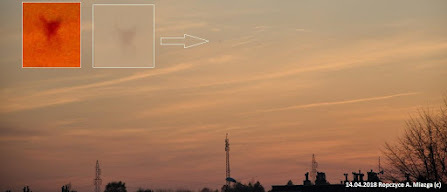 There is a matter of observation on April 14, 2018, in Ropczyce, something that brings to mind a flying humanoid. That day at 19:24 just after sunset, entering the kitchen I looked into the kitchen. The window I have towards SW. My attention immediately caught the distinctive dark point moving above. It's a telecommunication mast. At first I thought it was a motorbike, because on Saturdays often In the afternoon, two enthusiasts of this sport, when I took a closer look at it I said it was something completely different. I quickly ran to the room on the SLR, I set the appropriate parameters, and made the most close-up 4 photos, after which I decided to take a better look at it with binoculars. Interestingly enough, I saw through the binoculars more clearly “something” - writes something because it had the shape of a character, with the legs of a torso, and on top something like protrusions. It was interesting that This strange object was made of light–dark fog, it was not strictly a physical object but like a ‘cloud’ with such a shape that this one ‘smurka’ was clearly moving straight south, then rebounding to the right changing the direction, and after literally 20 seconds it disappeared like blown. I knew I was just witnessing something extraordinary.
