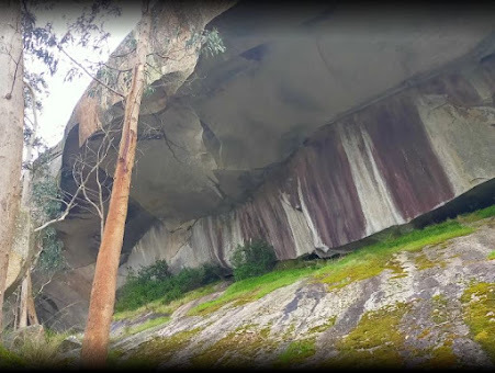 This occurred on the stated dates, in Victoria, Australia. I am from Canada, and I have been here for a year to perform unrelated research. My partner and I went camping in Mount Buangor State Park, at Middle Creek Campground. On December 28th, we hiked up Mt. Buangor to the Buckertillible Cave. Buckertillible means "cave" in Aboriginal Australian. It took approximately 1h 45m to reach the granite cave under an outcrop that measures approximately 100m long and 15m tall. It is a shallow cave, you can see the back wall across the entirety of the cave/outcrop. We had hiked about 2km up switchbacks through the bush to reach the destination.