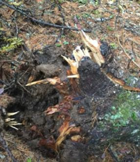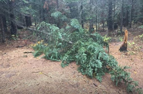 As I remember we went out the first afternoon to hunt for a few hours and then returned back to camp after dark. Nothing happened out of the ordinary the first night. The next day we woke up early to get out to a spot to hunt for the day. That day we returned to camp early afternoon for lunch and as we turned to head down the dirt path to our camp we immediately noticed a small tree that was uprooted like a carrot and placed across the path. Rob and I looked at each other and Rob said that wasn't there when we left this morning and he was right it wasn't there when we left. This was very weird, to say the least. I hopped out of the side-by-side to walk over and take a look. What we realized right away was that something had carried this tree and placed it there. There are no dirt drag marks like you'd see if someone or something had drug it in there. I picked up the tree and a bunch of dirt fell off the large rootball and the small tree was fairly heavy.