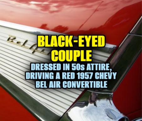 BLACK-EYED COUPLE Dressed in 50s Attire, Driving a Red 1957 Chevy Bel Air Convertible