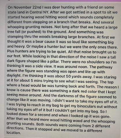 According to a Facebook group post a deer hunter in upstate New York claims that she spotted a large bipedal creature that she believes was a Sasquatch. The incident occurred on November 22, 2023, on some state land in the community of Steuben in Oneida County, NY, as posted on the Facebook page Bigfoot Researchers of the Hudson Valley. The unidentified hunter explained that the incident began shortly after she and a friend had settled in a spot to sit and watch for deer. The silence of the moment was suddenly pierced by the sound of wood striking wood followed by several whooping grunting noises. A screenshot of the incident report is posted below: