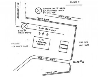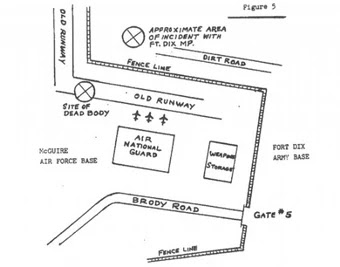 During the early morning hours of January 18, 1978, UFOs were sighted flying over Fort Dix and McGuire AFB, adjacent military bases. Shortly afterward, an Air Force security patrol was ordered to the back gate of McGuire AFB to allow entry to New Jersey State Police who were searching for something. One of the airmen on duty was Sgt. Jeff Morse (pseudonym). The state trooper told Morse that a Fort Dix MP was pursuing a low-flying object that had hovered over his car; then a small being with large head and slender body appeared in front of his car. The MP had panicked and shot the alien several times with a .45 automatic. The being had fled over the fence between the two bases, before falling and dying on the deserted runway.