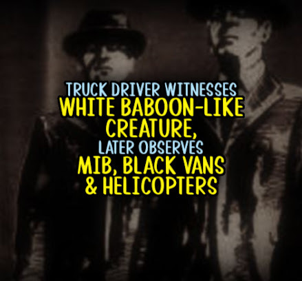 Truck Driver Witnesses WHITE BABOON-LIKE CREATURE, Later Observes MIB, BLACK VANS & HELICOPTERS!