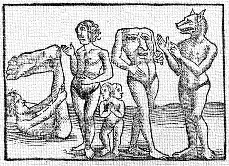 "Men go by the sea ocean by many isles, unto an isle that is called Nacumera, that is a good isle and fair. And it is in compass about more than a thousand mile. And all the men and women of that isle have hounds' heads, and they be called Cynoceptales (Greek for 'dog heads'). And they be full reasonable and of good understanding, save that they worship an ox for their God. And also every one of them beareth an ox of gold or of silver in his forehead, in token that they love well their God. And they go all naked save a little clout. They be great folk and well-fighting. And they have a great targe [shield] that covereth all the body, and a spear in their hand to fight with. And if they take any man in battle, anon they eat him." - The Travels of Sir John Mandeville (Penguin Classics)[image error]