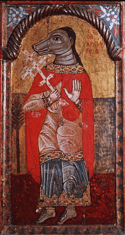 In the Eastern Orthodox Church, certain icons covertly identify Saint Christopher with the head of a dog. The background to the dog-headed Christopher is laid in the reign of the Emperor Diocletian, when a man named Reprebus, Rebrebus or Reprobus (the "reprobate" or "scoundrel") was captured in combat against tribes dwelling to the west of Egypt in Cyrenaica. To the unit of soldiers, according to the hagiographic narrative, was assigned the name numerus Marmaritarum or "Unit of the Marmaritae", which suggests an otherwise-unidentified "Marmaritae" (perhaps the same as the Marmaricae Berber tribe of Cyrenaica). He was reported to be of enormous size, with the head of a dog instead of a man, apparently a characteristic of the Marmaritae. This Byzantine depiction of St. Christopher as dog-headed resulted from their misinterpretation of the Latin term Cananeus to read canineus, that is, "canine.