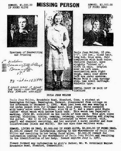 Welden lived with her parents and three younger sisters in Stamford, Connecticut when she was not in school. She enjoyed painting in oils and watercolors, pencil and charcoal sketching, and playing the guitar, she was physically active and an experienced hiker and camper. In part because of her father's lobbying after her disappearance, in July 1947 Vermont passed a law creating a state police force. Welden's disappearance remains unsolved; there has been no sign of her since 1946. - charleyproject.org