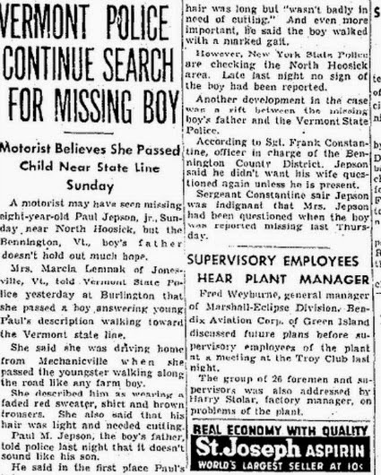 1950 - On October 12, Paul Jepson an eight year old went missing. His scent was followed by dogs, but it was lost on a highway.