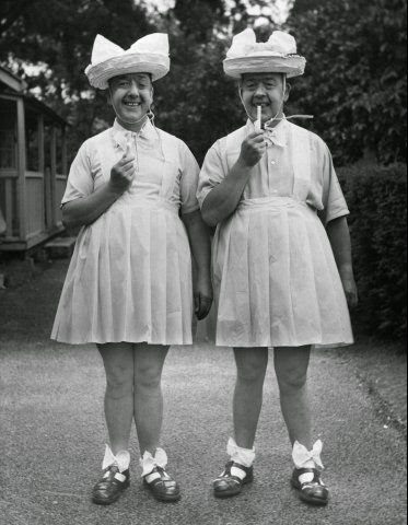 The Primwaddle Twins, Mort, and Harvey, circa 1929. Their mother, Discordia's husband left after seeing the homely pair. Embittered to men, left alone to raise boys, she insisted they were girls, and got away with it home-schooling them for 17 years; until Mort learned otherwise. The teenagers murdered her in her sleep, strangled in chiffon, her eyes gouged out and replaced with doll eyes.