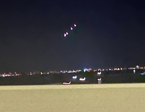 Photo #1) This line of globular objects (we saw 5 altogether) was seen in the sky near Ocean City, NJ around 9 pm this past Saturday night (September 16, 2023); the objects hovered there for around 5 minutes, before suddenly appearing to burst into an array of colors