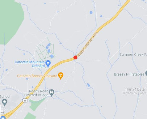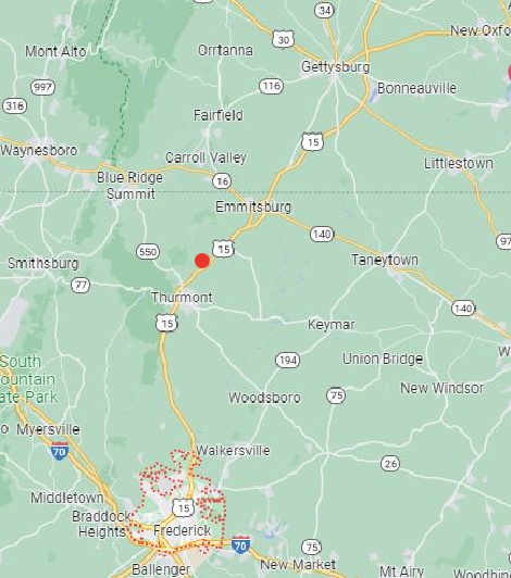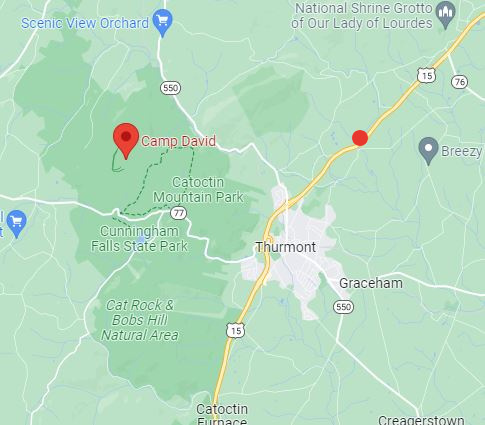 This particular sighting/encounter was near Catoctin Mountain Park (U.S. National Park Service) and within 3 miles of Camp David, the presidential retreat. Lon