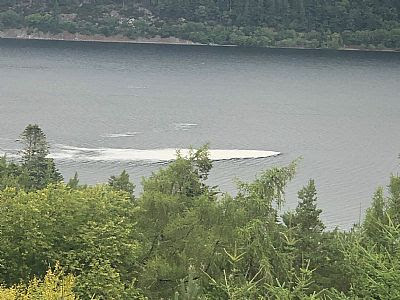 27 August 2023 - at 11.26am on the 27th of August, Siobhan Janaway, who lives locally, reported "There was something causing turmoil in the water off Foyers Point then it coalesced into a single object moving at speed just under the surface causing at least a 20m white wake" She confirmed that there were no boats near the location. She took this photo (below) of what she saw.
