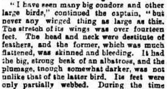 “I have seen many big condors and other large birds,” continued the captain, “but never any winged thing as large as this. The stretch of its wings was over fourteen feet [ 4.27 m ]. The head and neck were destitute of feathers, and the former, which was much flattened, was skinned and bleeding. It had the big, strong beak of an albatross, and the plumage though somewhat darker, was not unlike that of the latter bird. Its feet were only partially webbed. During the time we had it on board and until it died it was not seen to eat, but slept constantly, and it took some rough handling to awaken it.” (Source: Sydney Mail 17 November 1888, p1045, reprinted from the San Francisco Examiner).