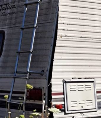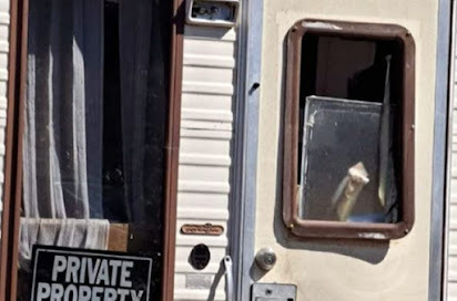 I backed up, getting in the motorhome, and locking the door. Well, it peeked in the window behind the swivel chair where I put my two grocery bags. It was headed to the door. My cell phone was in the PT Cruiser on the charging cord. This big fella placed its big hand against the door's window pressing it so hard that it stripped the screws, cracking the plastic trim ring inward. I kept saying, "Good boy. Go get some apples." It then went to the back driver's side corner of the motorhome. It peeled the bottom corner clear up to the back roof line. The generator broke loose and was on the ground.