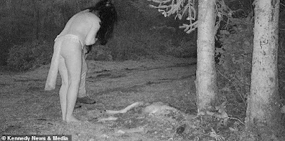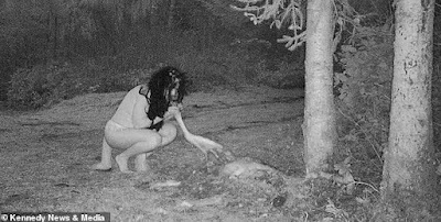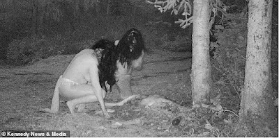 A nature lover’s wildlife camera captured the disturbing moment when a pair of near-naked women held a supposed 'carcass-eating ritual' near her home after sundown.