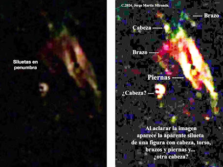 A little higher up was something elongated that when we clarified the image showed us the physical conformation of something anthropomorphic, something that seemed to have a head, torso, arms, and legs or paws that were very strange since they were elongated and the lower part of them looked a little twisted.