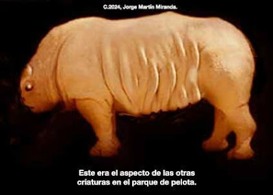 “They were grotesque-looking creatures with a body similar to that of rhinoceroses, with four legs, with heads almost without snouts, flat noses, and without horns. Their bodies looked plump, with fleshy ‘chichos’ on their abdomens. Their physique looked like a mix between rhinoceroses and pigs, large and with their flat snouts (see illustration).”
