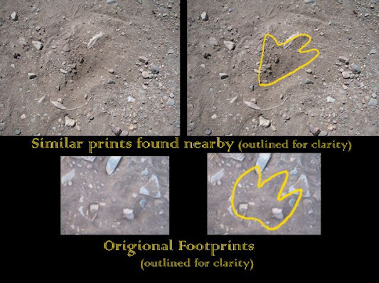 Then, something in the dirt caught my eye. I stopped and bent down to examine it. It appeared to be a footprint of some kind. Most of the dirt around the print was too hard-packed to make much of a footprint with only a thin layer of loose dust. But occasionally, as was the case, there would be a small patch of dirt loose and thick enough to make a decent print. The print was about 3.5 inches wide and 3.5 inches long with three, thick, bird-like toes. From what I've seen of the trail wildlife, there isn't anything big enough to make a decent track much less one as strange and bizarre as this. Of course, it got me really excited and I searched for more footprints like it. There was evidence of other footprints leading up to the original, but they were on the packed stuff and therefore, were not very legible. As I said, I got really excited and promptly began beating myself up for not having a camera with me. Fortunately, the backbone was shielding most of the wind, the print was off on the side of the trail and there was enough gravel to keep its shape long enough for me to go back home (we live very close to the trailhead), get a camera and snap a few photos (see picture).