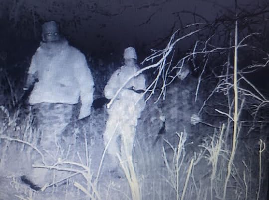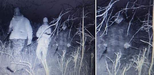 “So, while looking through my game cam pics today (March 12, 2023), this kind of gave me chills. That is me in the front, then my daughter Cheyanne, and we don't know who the third person is. Zooming in, you can't make out the face, and....the body is transparent! We even compared it to another pic and can see the branch through him. I think I need to call Ghostbusters! I didn’t find any others like that. Tons of wildlife though.