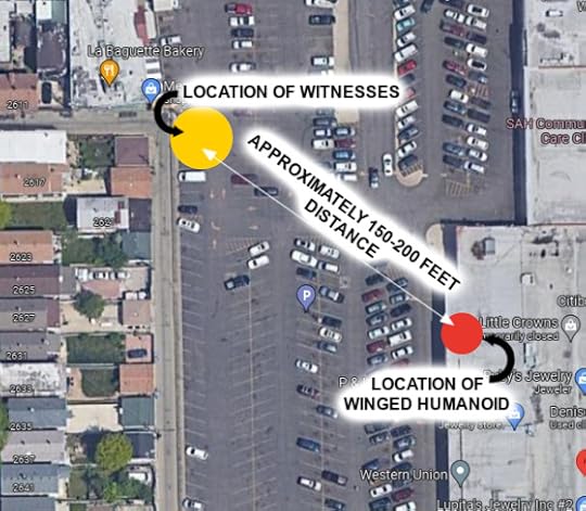 NOTE: I have included several Google Maps screenshots of the location (below) with notations. The bakery location is 3117 W. 26th St. in the Little Village Plaza. The flea market (Discount Mall) is southwest of the bakery on the opposite end of the parking lot. The distance between the witnesses and the winged humanoid, according to the map key, was approximately 150-200 feet.