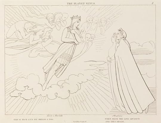 Dante Alighieri and his beloved Beatrice visit the paradise planet of Venus in the Divine Comedy-Paradise (1321), Cantos III and IX. Illustration by English artist John Flaxman, made on 1 May 1807, for English translation of Dante’s poetic trilogy. On display in the Royal Academy of Arts, London, United Kingdom.