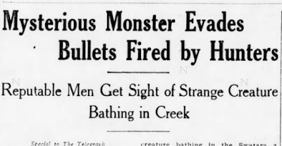 Bind Naugles Church, Pa. Oct. 15.-- Last night a party composed of fifteen men and boys, all of them armed, set out in quest of the strange animal that is alleged to have its lair in a cavern along the Swatara Creek. The net result of the expedition is that one member of the party claims that he got a glimpse of the mysterious monster and fired a shot at it and missed. That is, he presumes that he failed to hit the beast, as he claims that it shook its head savagely and ran away. Another member of the party verifies this story and says the animal disappeared in Adam Bolt's meadow.