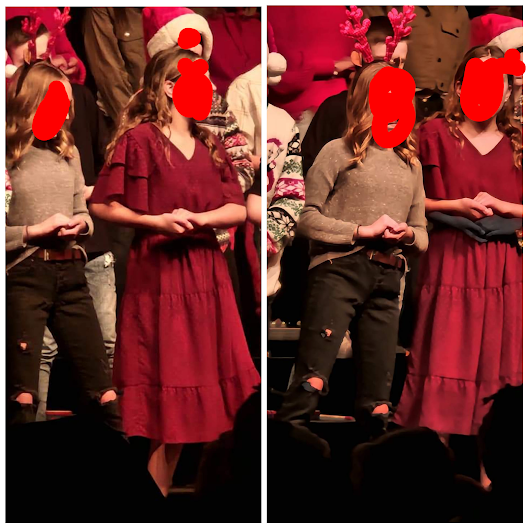 "Can someone explain the right picture? They were taken seconds apart as the kids were singing. It is freaky! My son says the night mode in the phone might have created it.