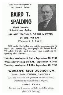 Lecture series by Baird T. Spalding on the “Life and Teachings of the Masters of the Far East” presented in Fontana, California, in September 1951.