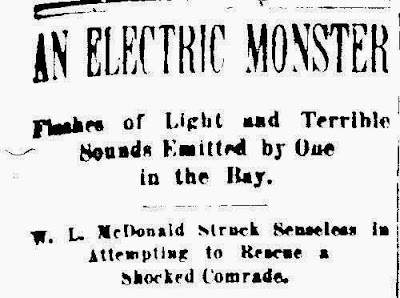 Flashes of Light and Terrible Sounds Emitted by One in the Bay. -- W.L. McDonald Struck Senseless in Attempting to Rescue a Shocked Comrade. -- Nearly 150 Feet Long and Covered With Coarse Hair -- A Fishing Party's Trip Cut Short.