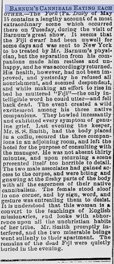 "A few days ago the York Daily had an article in its columns, stating that the cannibal belonging to the Barnum show that died here last Tuesday, was partly eaten up by his companions, during the temporary absence of their keeper. We have since learned that there is not a word of truth in the story, that the Daily was liberally paid for the insertion and the whole thing was furnished to that paper, cut and dry, by the proprietor, as an advertising dodge.