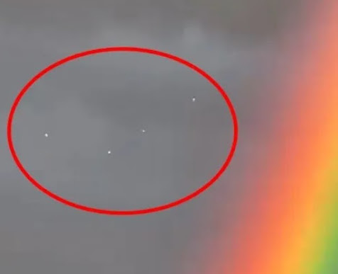 Footage seems to show a cluster of unidentified lights weaving through the brooding sky next to the rare rainbow.