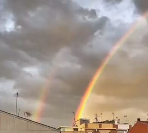 The bizarre moment in Barcelona was filmed just days before the horrific floods that have battered the country. The clip shows little white specs of light contrasted by the gorgeous rainbow, in what feels like an unsettling image in hindsight.