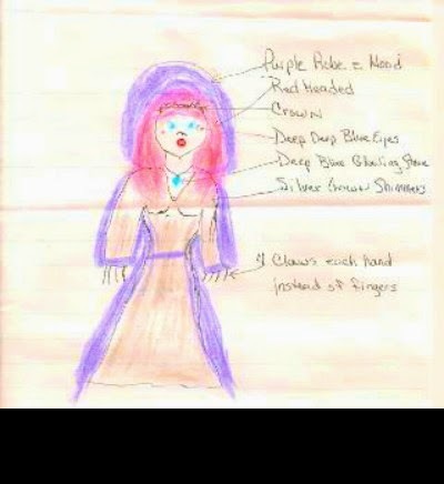 This woman had bright red long hair, with what appeared to be a crown on her head. She had white skin with very beautiful dark deep blue slanted upward eyes. She has a small nose and a round mouth and talks like a human and her mouth moves! She is dressed in a shimmering silver gown with a dark purple hooded robe over it. She has on a dark deep blue diamond-shaped stone that glows brilliant and bright. She had a very kind and trusting voice. I was amazed at this lady. I don't know if she was a queen or princess or what. I'm still partly afraid though cause I don't know what she wants with me. I saw no feet but her gown did drag the floor.