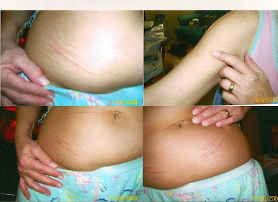 Then I was back in my bed and, for a while, I could not move and speak, but as soon as I could I asked my husband where did the bright light go and where did the Greys and that woman go. He said he didn't see anything as usual. I got up at 6 am, tired and drained of energy. When I went to put my clothes on I noticed whelp marks on both sides of my abdomen. My husband took pictures of them and a red area on my inner right arm. As the day went on the whelp on my abdomen got redder and looked like some kind of scratches! By night they were red. Pictures were taken of all areas that day and at night I had one appear on each upper arm. Pictures were taken of them also. I had nightmares off and on that night and more pics were taken on 12-1-2008. I had nightmares that night also. I have never seen that woman before - or shown anything or walked on that craft!! Yes, I am scared to death, but I know my life has to go on!! Just pray they don't come back!!