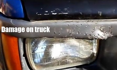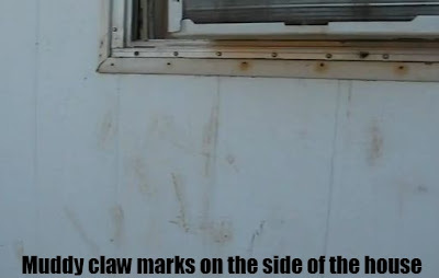 There has been damage to the house and a vehicle as a result of these attacks. Deep claw and chew marks can be seen on the truck headlight housing and grill. There have been a few 3-claw prints left on the side of the house and on the ground around the residence.