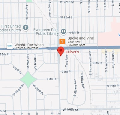 Lisa L. contacted me by telephone in response to my email. She stated that on Tuesday, March 5, 2024, while waiting for an order in the drive-thru at the Culver's Restaurant, located at 9515 S Kedzie Ave, Evergreen Park, Illinois, she observed a flying humanoid figure in the sky. Evergreen Park, Illinois is a suburb located southwest of downtown Chicago.