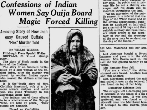 The following newspaper account is an example of blatant racism towards Native Americans in society and the press during the 1920's 1930's. The two women in this incident used a Ouija board to communicate with a deceased husband. As a result, they believed they were given the name of the killer, and then proceeded to gain revenge. The murder was blamed on witchcraft. Be warned of the content that follows: