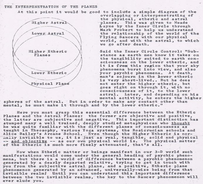 From Keller Venus Files: Below is mimeographed copy with excerpt from page 26 of Riley Hansard Crabb’s Flying Saucers Uncensored (Vista, California: Borderland Sciences Research Associates, 1965), explaining the various planes of existence and their interaction with one another. For a good description of the planet Venus at multidimensional levels and its connection to the inner world of Agartha, please check out Chapter II, “Things More Bizarre,” in Dr. Raymond Keller’s Final Countdown: Rockets to Venus (Terra Alta, West Virginia: Headline Books, 2017), pages 21-32.