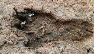 The footprints — if that's what they are — are about 13 inches long and 6 inches wide. They have a rounded heel like a human's, but spread out into what looks like a set of five dangerous claws.