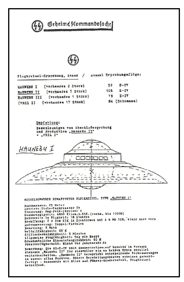 "The crashed disk was transported to the Hirschberg SS base and kept under very strong guard and super top security. The disk was 7.6 meter in diameter and 3.8 meters high. It consisted of a large “overwhelming” dome, encircled by a narrow outer rim, and smaller flat dome on the bottom with a flat lower section. The top of the dome was also flat and large. The craft had 6 oval-shaped structures resembling portholes but not transparent, or devices that radiated some type of light, located near the base of the upper dome. On the lower surface of the outer rim the craft had 12 lights. The color of the disk was a dull metal gray. There was an insignia on the dome resembling the letter “T” with 2 props on its sides. The entrance into the disk was found on the top of the upper dome. The general shape of the disk resembled that of a German soldier’s helmet with a small protrusion on the bottom."