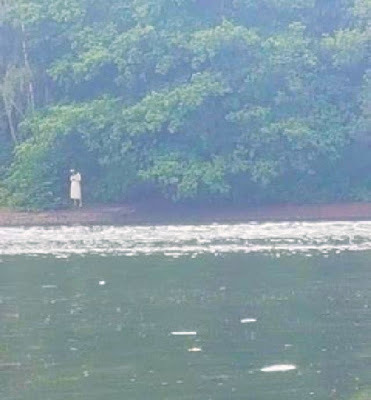I started to row away not taking our eyes off her. As I rowed around a small island in the lake she lifted her arm in some strange wave. I was fuming! The kids were screaming. I rowed around the island to get back to her ASAP. I threw my phone at my son to take pics. She had by then resumed her creepy pose. As I got closer she dropped to the ground and started scratching at the ground. She then stood back up and walked a metre or so along the embankment and then she was gone.