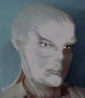 I followed about 25 feet behind him with several people between us. When he got to the BART station he suddenly stopped, and stood with his back to me until he spun around and stared directly at my face. I was completely shocked. He knew I was following him. Again he made the weird movements, like he wanted to communicate but couldn't, then he walked into the station. I panicked and ran away back to the stall." (originally reported to MUFON - witness' sketch below)