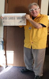 Dr. Raymond Keller, a.k.a. “Cosmic Ray,” displays newspaper article from the Toronto, Canada, Telegram newspaper of Tuesday, 14 April 1959, describing amazing flight characteristics of U.S. Department of Defense-contracted flying saucer built by the Avro Corporation of Canada. Saucer depicted in the article is in sharp contrast to the one published in the United States and tested by the Air Force, that said the Avro disc was a flop and only got a few feet off the ground. Someone was not telling the truth. Medallion worn by Dr. Keller is for the Royal Order of Melchizedek, bestowed on members of Dr. Frank Stranges’ Inner Circle, formerly of Van Nuys, California.