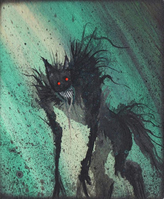 It was probably 100 feet ahead of me, loping out of the woods like a dog would lope through deep snow. It was almost black in color except for enormous reflective eyes that were the size of dinner plates glowing back at me. It had thin legs like a deer, but was easily twice my size, covered in long matted fur. It had the face of a dog and a tail that extended probably two feet behind it. It almost looked like it was grimacing as it moved, like I caught it in when it was vulnerable. It didn't slow down though, loping the full width of the street in maybe five hops before disappearing among more trees.