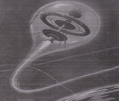 Since the G-ship would take off and land in an atmosphere, however, there would also be the problems of heat caused by air friction and the question of the air drag of the spherical shape. To reduce the friction heat, Canadian scientists, headed by radio engineer Wilbur B. Smith of Project Magnet in Shirley’s Bay, Ontario, just outside of Ottawa, contemplate the employment of an ingenious electromagnetic apparatus. According to Smith, “The device would be switched on before take-off, thus attracting and holding fast a large portion of air around the ship. This captured ‘boundary cushion’ would move with the ship. Therefore, the air friction would take place at a distance from the ship’s structure and the heat would be dissipated before it could warm up the ship’s anti-gravity shield. The mass of captive air would be shaped into the most advantageous aerodynamic form- a tear-drop for moderate speeds, a sharp-ended spindle for supersonics and a concave, cup-like shape for adding deceleration for landing.”