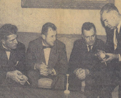 From Keller Venus Files: Lawrence D. Bell, founder and president of Bell Aircraft Corporation of Buffalo, New York, uses a Japanese ivory ball to illustrate his view that humans before long will operate planes outside the Earth’s atmosphere, then outside the gravity field of the Earth. The Air Force test pilots with him are Lt. Col. Frank J. Everest (left), Maj. Charles Yeager (in light suit, center), and in uniform next to President Bell, Major Arthur Murray.
